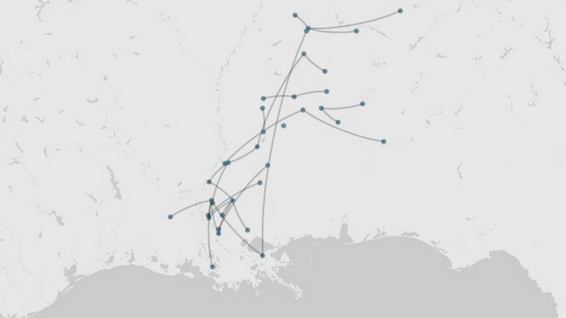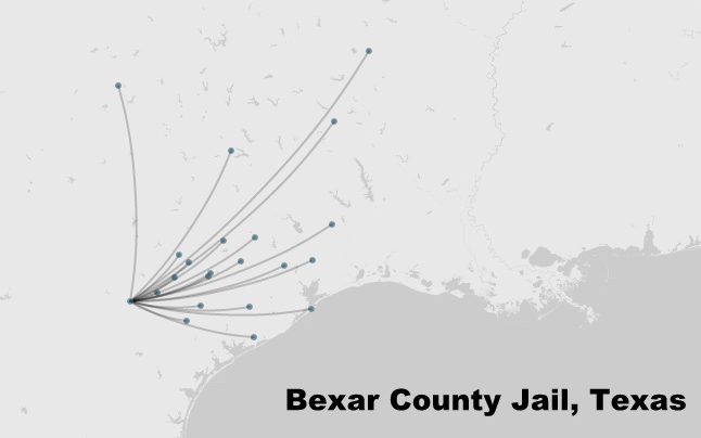 That map is such a vivid presentation of paths using graphs! I am surprised that the locations of nodes are detailed to the address of jails rather than, for example, some centroid of states. I also think that altering the size of nodes based on population is a great idea for visualizing the data. I would be interested to see what determines how the edges are curved (towards one side rather than the other).